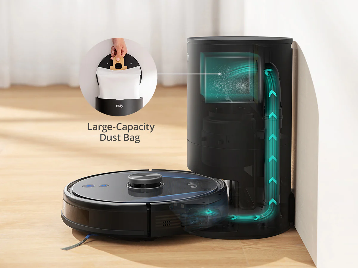 - The large-capacity dust bag can store up to 60 days* of debris, and when it is full, simply remove and throw it away.