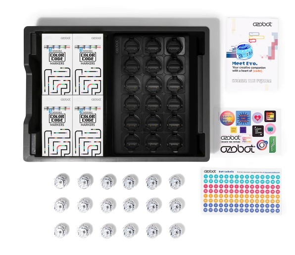 - The Evo Classroom Kit comes with 18 Evo robots, 18 Dual-tip Color Code marker packs, bot stickers, wireless charging cradle and accessories. K-12 students can code Evo two ways: screen-free with Color Code markers and online with Ozobot Blockly visual programming or Python. Pair with a free Ozobot Classroom account to access over 700 free lessons covering STEAM, CS, and core subjects.