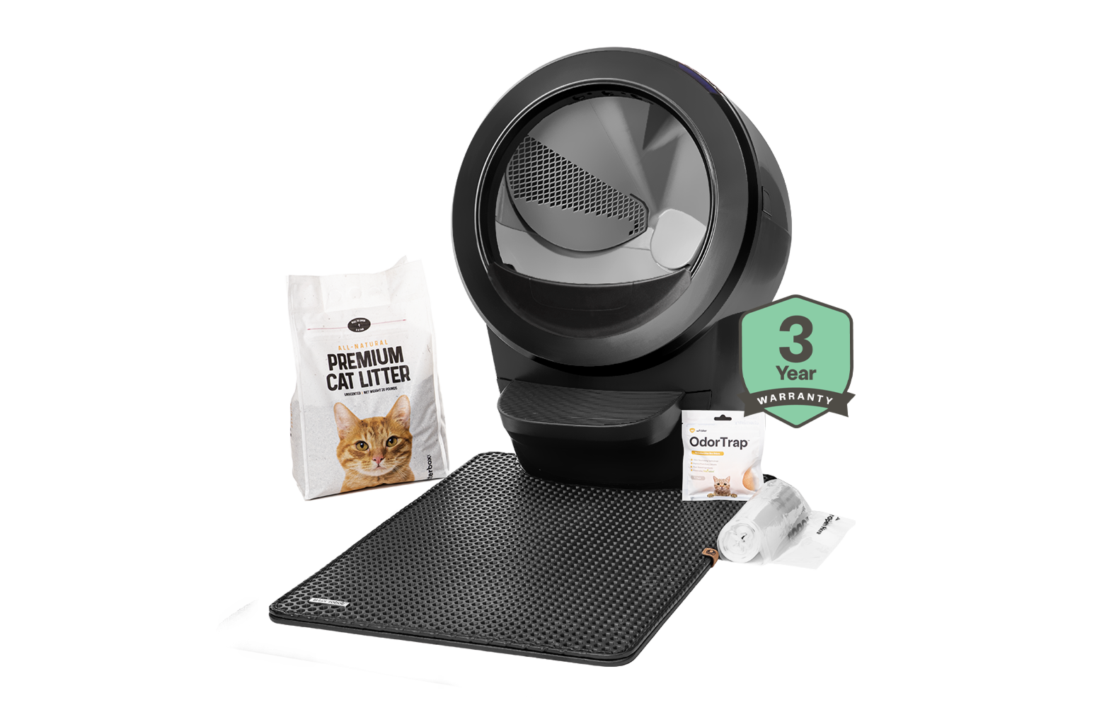 • Say goodbye to kicked-up litter and stubborn litter box odors with the Trap Bundle! You’ll receive Litter-Robot 4, a Litter-Robot Litter Trap™ Mat, OdorTrap® 6-pack, and comprehensive coverage with our WhiskerCare™ Extended Warranty.