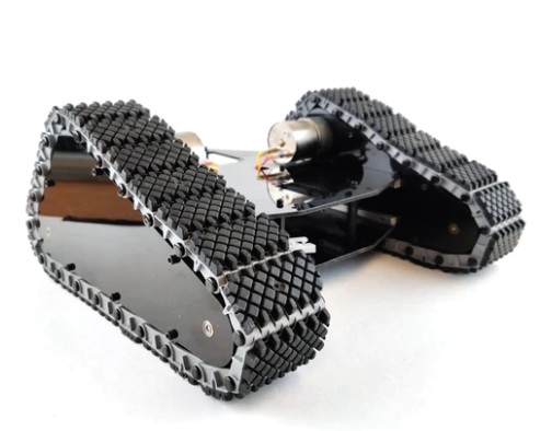 The Lynxmotion Tri-Track Chassis Kit is a robust Tracked Development Platform for your RC or autonomous robot experimentation. The robot is designed for indoor or outdoor use and performs well on many different surfaces. With the addition of the optional Base Rotate a robot arm or large sensor array can be added, or even a Johnny 5 style robot can be made! The chassis is designed to accept the Lynxmotion Mini Atom Bot Board V2 and/or the Lynxmotion SSC-32 Servo Controller . There’s room for the Dimension Engineering Sabertooth Dual 5A Regenerative Motor Driver motor controller and a new 12vdc 1600mAh Lynxmotion battery pack (Coming soon) with room to spare. The robot is capable of carrying up to a 5lb payload.