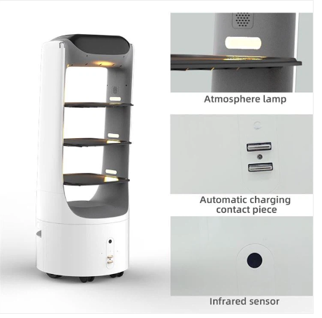 - Restaurant delivery robot can optimize the manpower configuration, efficiently and accurately deliver the dishes to the designated table position, has the active obstacle avoidance function, and provides intelligent prompts, automatic charging, running status prompts, and automatic selection of the food delivery route.