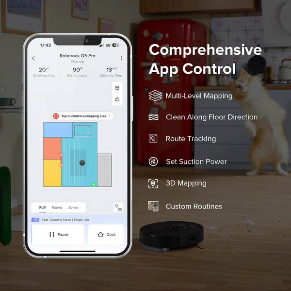 - Featuring a spacious 770ml onboard dustbin, the Q5 Pro efficiently handles long pet hair, enhancing the convenience of your cleaning routine.