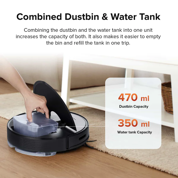 - Combining the dustbin and the water tank into one unit increases the capacity of both. It also makes it easier to empty the bin and refill the tank in one trip.