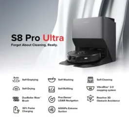 - Forget about cleaning, including robot maintenance. With Roborock’s all-in-one docking system – RockDock™ Ultra, and the most advanced cleaning technologies – DuoRoller Riser™ Brush and VibraRise® 2.0 Mopping System, S8 Pro Ultra is here to free your time.