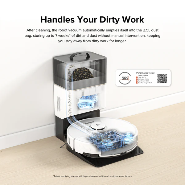 - After cleaning, the robot vacuum automatically empties itself into the 2.5L dust bag, storing up to 7 weeks of dirt and dust without manual intervention, keeping you stay away from dirty work for longer.