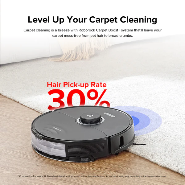 - Carpet cleaning is a breeze with Roborock Carpet Boost+ system that’ll leave your carpet mess-free from pet hair to bread crumbs.