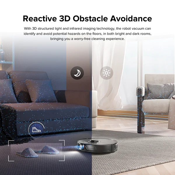 - With 3D structured light and infrared imaging technology, Reactive 3D Obstacle Avoidance system can help the robot vacuum identify and avoid potential hazards on the floors, in both bright and dark rooms, bringing you a worry-free cleaning experience.