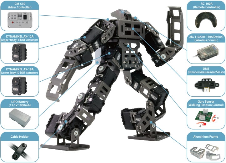 - Top-notch humanoid armed with high performance actuator DYNAMIXEL AX-18A
