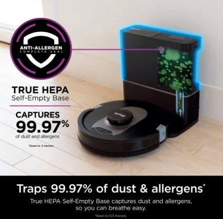 - It empties itself: the bagless, self-emptying base holds up to 60 days of dirt and debris while its true hepa filtration captures and traps 99.97%* of dust and allergens (*down to .3 microns).
