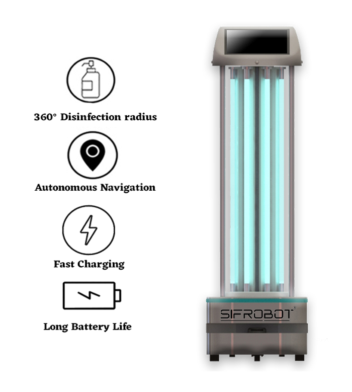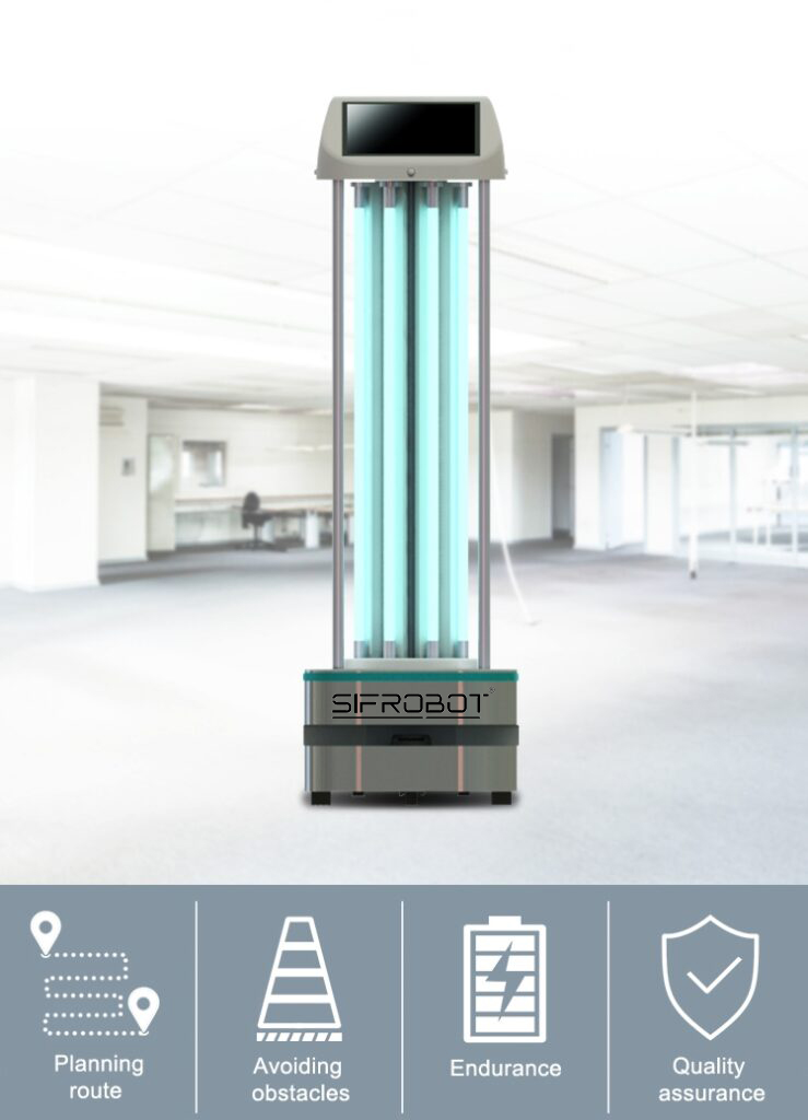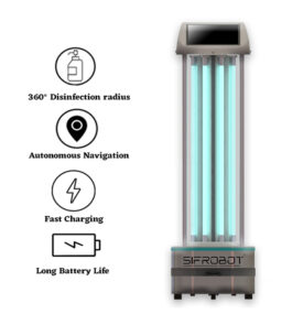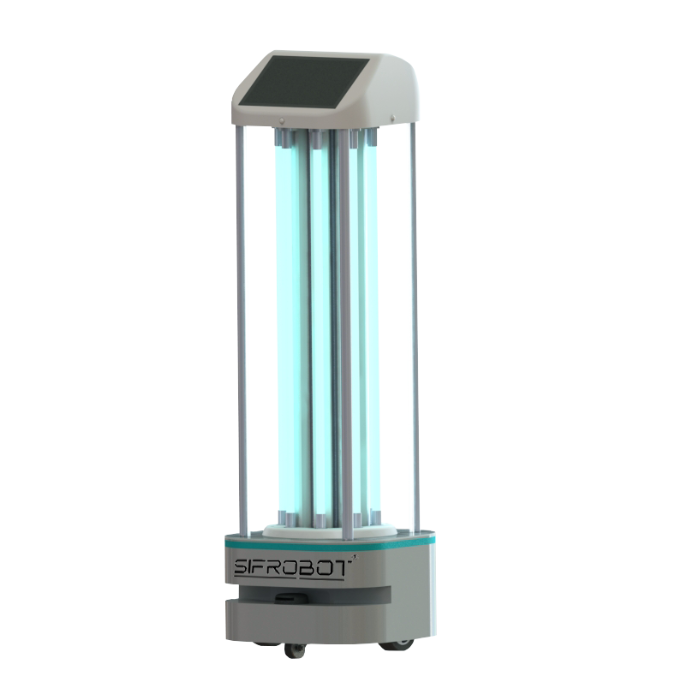 - Autonomous UVC Disinfection Robot: SIFROBOT-6.57 is a general-purpose wheeled chassis combined with ultraviolet sterilization lamp. It is suitable for shopping malls, schools, office areas and other places where sterilization can be blocked on flat ground