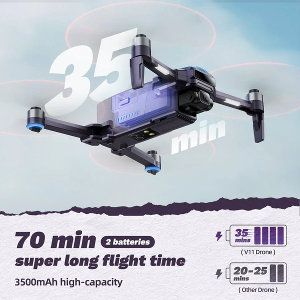 The V11 drone features a stunning 4K camera that ensures vivid clarity. With a 2-axis gimbal and electronic image stabilization (EIS), your aerial shots are always steady and impressive.